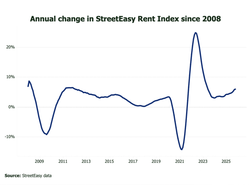 While national rents may cool, NYC rental market predictions for 2026 forecast quicker increases. Through October 2025, the StreetEasy Rent Index showed 4.8% year-over-year growth, with vacancies tightening further. NYC's rental undersupply—dating back to the 1990s—persists despite post-pandemic builds, creating a persistent gap.