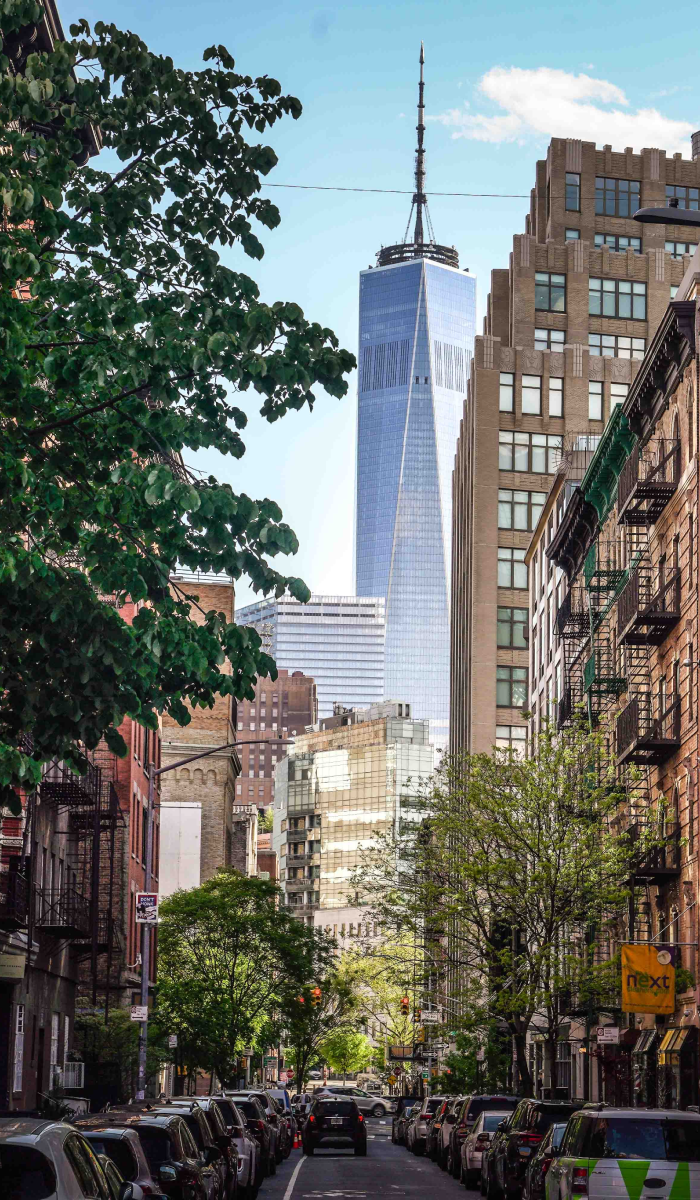 Thompson Street — Quiet, tree-lined, residential, and a picture-perfect view of the Freedom Towner (pictured to the right).